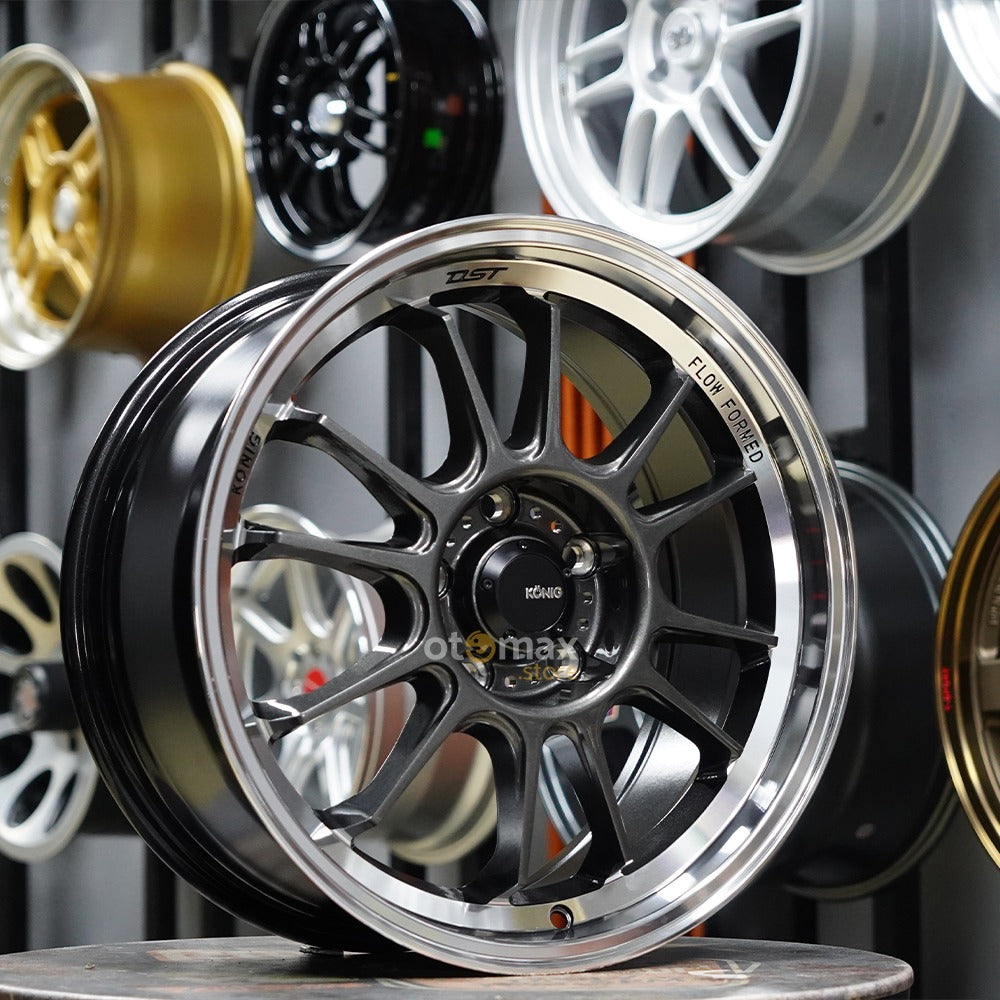 Kombinasi Metallic Carbon dan Machined Lip menciptakan visual sporty dengan nuansa mewah khas Konig Wheels. -